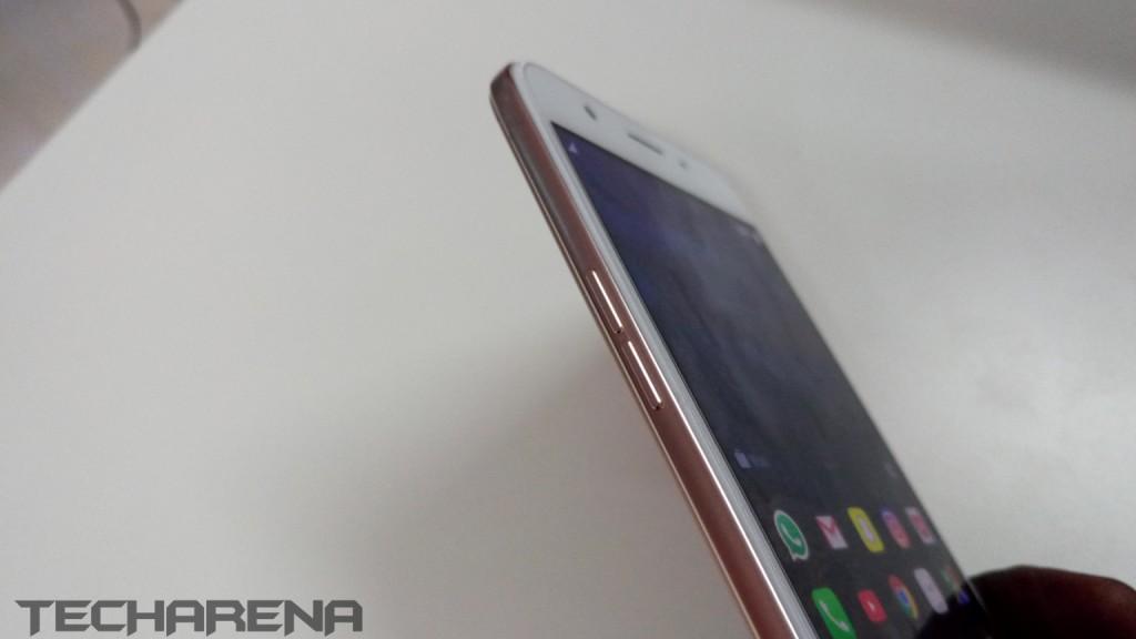 As I have mentioned above, the fingerprint sensor is embedded in the physical home button. The capacitive buttons next to it are backlit making it easier for you to see them in the dark. At the bottom of the OPPO F1s are two speaker grilles (only one has actual speakers, the other one is for aesthetics), headphone jack and the MicroUSB port. The power button is on the right with the volume keys on the left. The SIM card/MicroSD tray is also on the right.